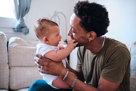 Close Up Of Loving Father Holding Newborn Baby Son At Home In Loft Apartment