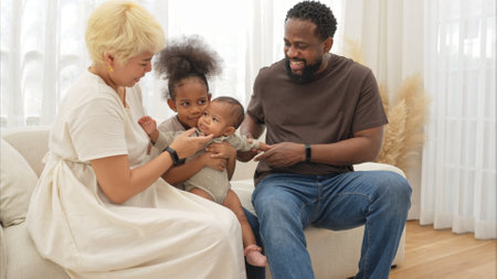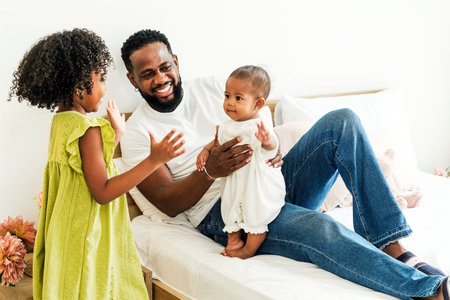 A joyful moment between an African father and his two children, celebrating love and connection in a cozy, bright room. Happy diversity family concept.