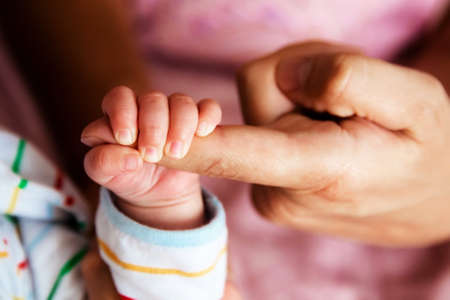 Babys hand. The father holds with tenderness and love the small hand of the newborn. New life, parental protection, care, love, child and baby health
