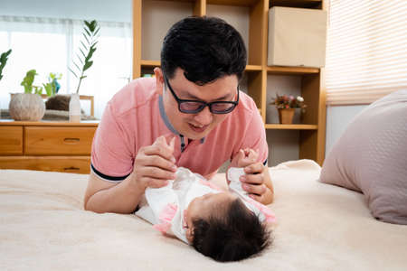 An Asian father in glasses is teasing and playing with his 3 month old newborn daughter in bed in the bedroom with the love. A man who is a single father is taking care of his daughter.