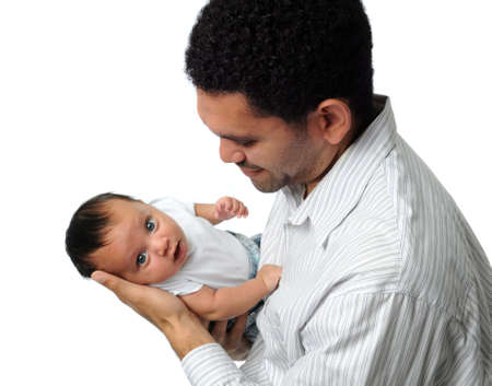 A tender moment of a father holding his baby, as the infant looks up with curiosity and trust. The warm interaction reflects family love, bonding, and parental care.