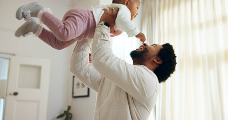 Smile, father and playful with black child in home for bonding, support and game together. Happiness, connection and airplane fantasy with man and daughter in family house for care, trust and love