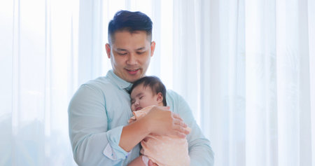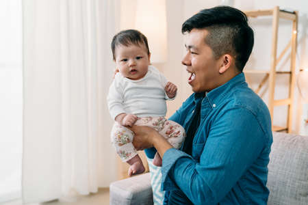 asian young dad standing by window is hugging baby happily and tapping infant at home