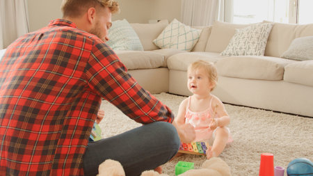Man playing with tired baby on nursery floor, new dad and infant bonding with toys in bedroom at home. Family, love and development, father and child in playroom, teaching and learning with fun toy.