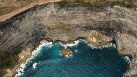 Cliff with waves crashing against a rocky shore, Nusa Penida, Indonesia. Aerial view Rocky shore and ocean with waves and rocky cliff. Travel concept.