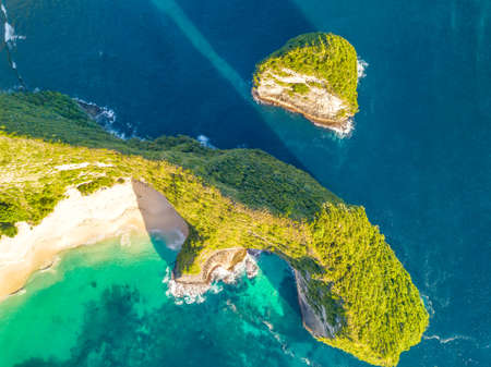 Sunset Rocks Location Pasih Uwug Beach island Nusa Penida Bali Indonesia, ocean, baliaerial view crystal cove with arch, drone perspective showing shimmering shallow water, coral patches