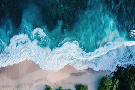 An aerial perspective captures vibrant turquoise waves crashing onto a sandy shore. The composition reveals a contrast between the blue ocean and the tan beach, accented by a rocky outcropping. This image could be used for travel, tourism, or environmental themes.