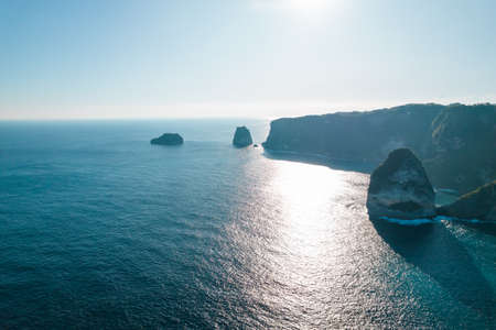 Aerial view at sea and rocks. Natural landscape. Kelingking beach. Nusa Penida. Bali. Indonesia. Blue water background from top view. Travel and vacation image.