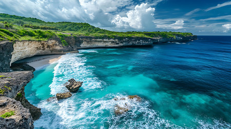 Uluwatu cliff with crystal blue water and gold beach in Indonesia. Bali landscape from top view from a mountain peak. Travel paradise destination for a couple in searching for adventure.