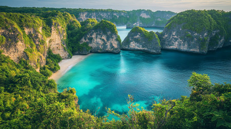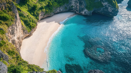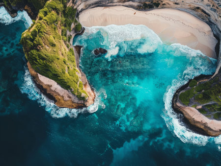 An aerial view presents a stunning coastal panorama with vibrant turquoise waters, a sandy beach, and towering cliffs. The scene is illuminated by warm natural light creating a sense of tranquility. This image could be used for travel websites, environmental projects, and various editorial purposes.