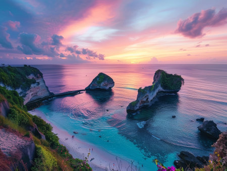 Sunset Rocks Location Pasih Uwug Beach island Nusa Penida Bali Indonesia, tranquil inlet surrounded by rugged cliffs, calm waters beneath stone arch with lush greenery