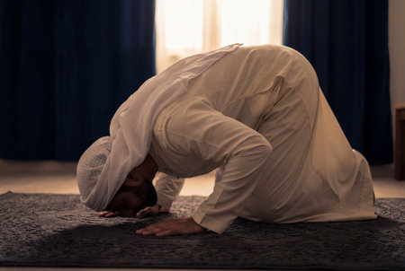A faithful muslim man wearing traditional white clothing prostrates on a patterned prayer rug in a quiet room while performing daily islamic prayers near a bright window.