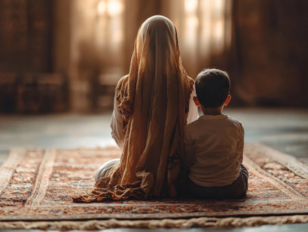 Muslim woman in hijab guides her children in prayer home creating serene atmosphere beautifully patterned prayer rug and gentle lighting during Eid al Fitr.