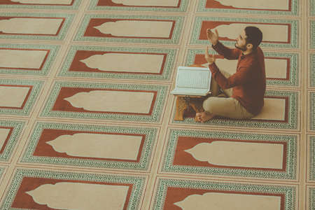 Young Arabic Muslim man praying. Doing a dailly pray inside modern beautiful mosque.