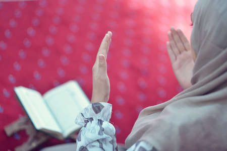rear view of muslim women hand praying on ramadan