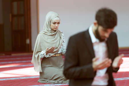Muslim man and woman praying in mosque.