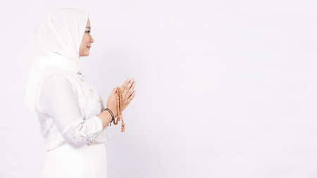 Asian muslim woman wearing prayer beads welcoming guests or Ied Fitr Greeting in white background