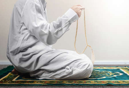 Muslim man praying with prayer beads on his hands while sitting on the prayer rug with white wall background
