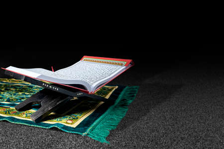 Quran in the mosque - open for prayers The black background of the Muslims around the world placed on a wooden board Quran in the mosque - open for prayers