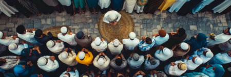 Aerial view of the crowd of Muslim people attending a religious ceremony. A panoramic shot capturing people from different cultures