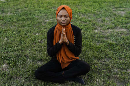 Black muslim woman meditating yoga and pray on grass. Lifestyle of african female