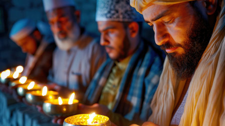 A group of four men dressed in traditional attire unites in prayer, holding lit candles that illuminate their focused expressions in a peaceful, night setting.