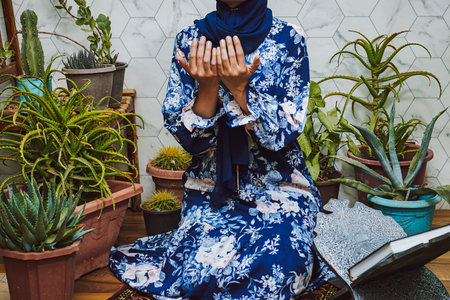 Muslim woman praying and make douaa for Allah muslim god at room near home garden interior . Hands of muslim woman on the carpet praying