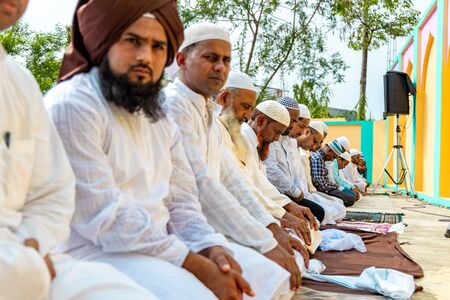Bhairahawa, Nepal - June 5 2019: Asian Muslim devotees sitting in a row getting ready for Eid Prayers.