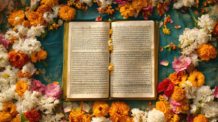 The Sikh scripture Guru Granth Sahib adorned with flowers and a ceremonial cloth. High angle view, copy space -
