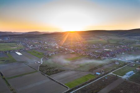 Small town village during the sunrise with fog. surrounded by hills in lower austria. Aerial drone photo