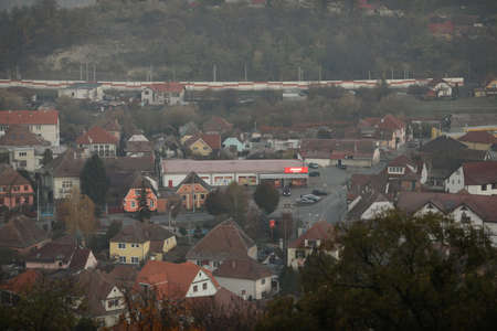 Sighisoara, Romania - 30 October 2021: Overview of the Transylvanian town of Sighisoara early in the morning.