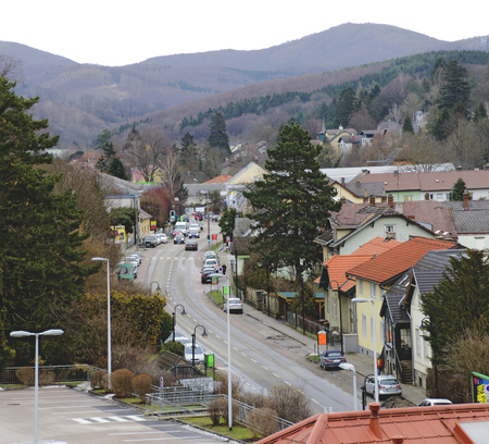main road of a little town in the viennese forest, Pressbaum (Neulengbacher road, federal highway B44), driving direction to Vienna, Austria