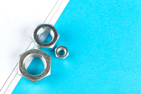 Blue industry or construction abstract background with various nuts on blue surface creative photo.
