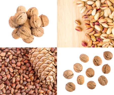Coconut, macadamia, pecan, walnuts, peanuts and hazelnuts on white