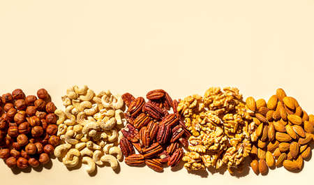 Various nuts on a beige background. Walnuts, almonds, hazelnuts and cashews, pecans. Organic vegetarian food, healthy snacks.