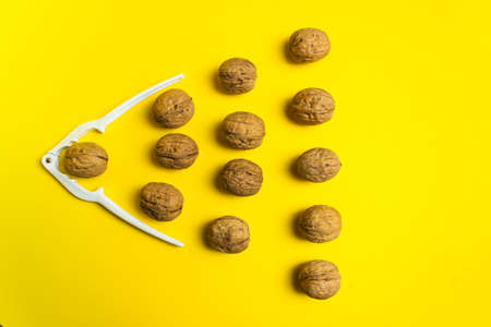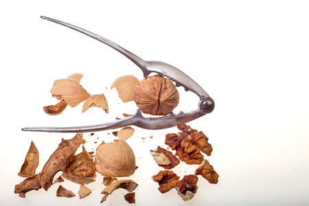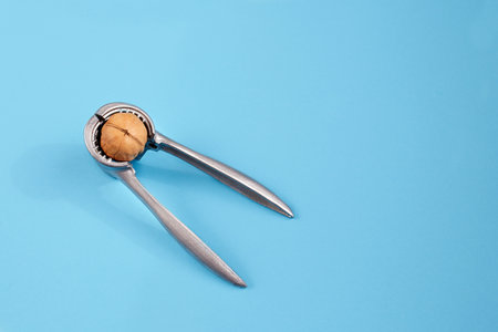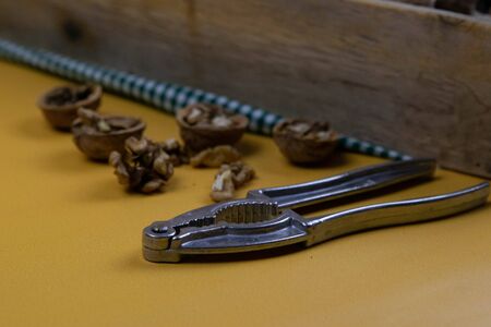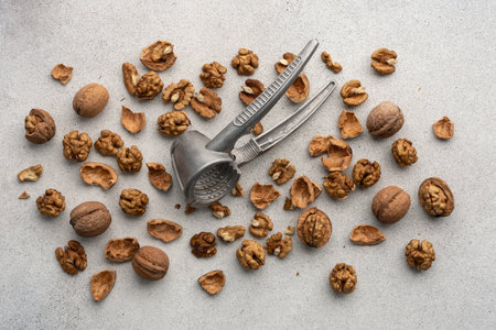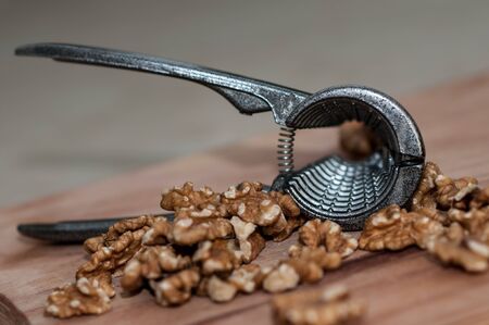Metal nutcracker with scattered walnut shells. Minimal still life concept of natural food, simplicity, and healthy lifestyle.