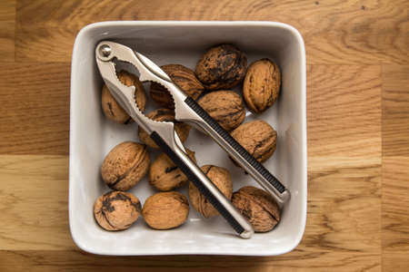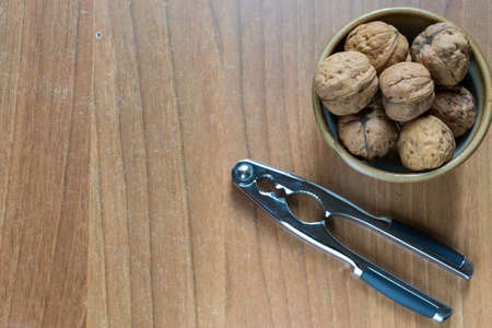 Walnut. A shell and nutcracker on a wooden table. Top view