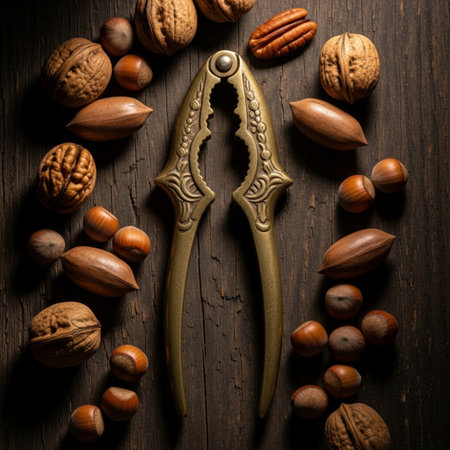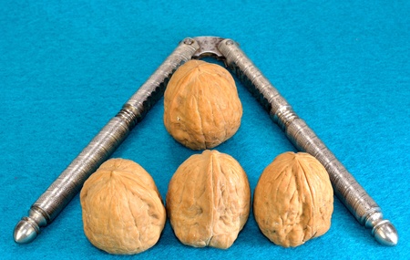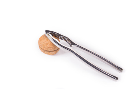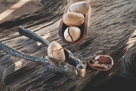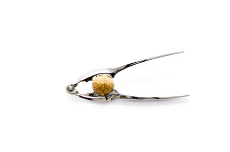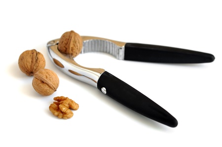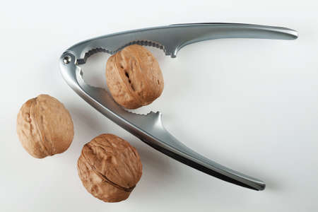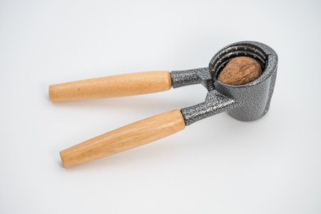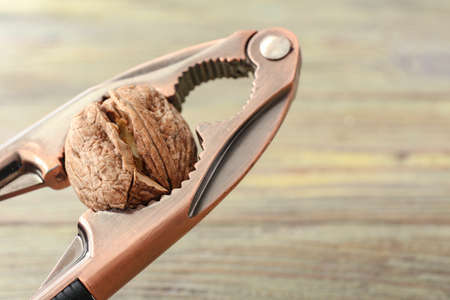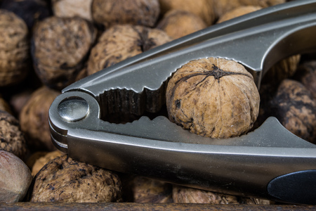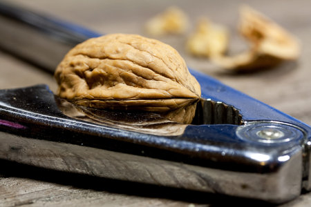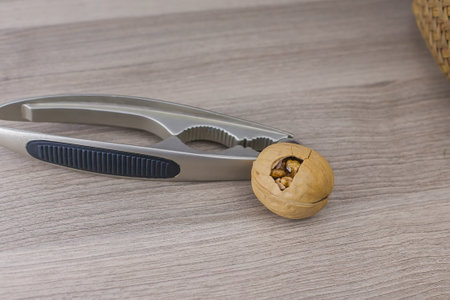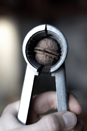 Cracking a walnut in the nutcracker. Natural light shining through the window on an object