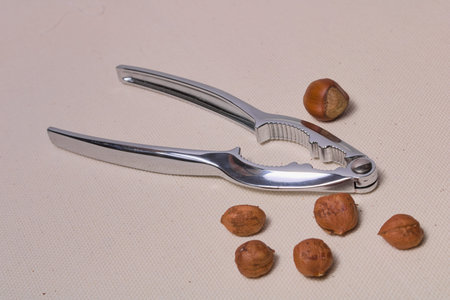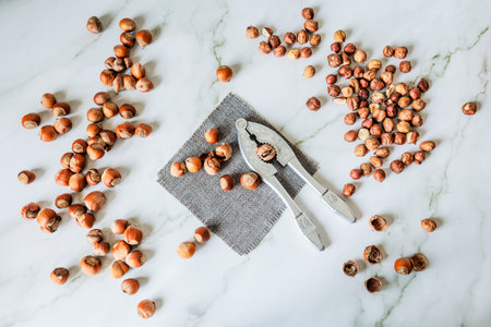 Nut cracking tool with scattered shelled hazelnuts on marble background