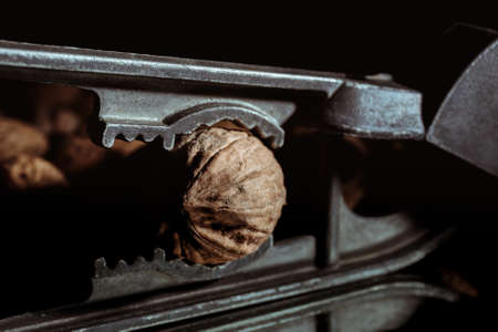 Walnut in nutcracker close-up. Copy space. Beautiful dark background with healthy food ingredient. Useful nutrients. Nut is tasty diet snack. Brown color. Nutshell tool. Full shell. Banner. Wallpaper.