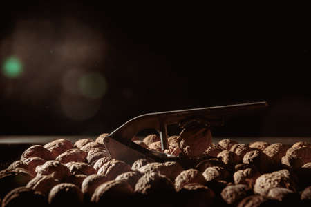 Walnut in a nutcracker close-up. Dark background. Beautiful background with food. Healthy ingredient. Useful Nutrients. Tasty diet snack. Macro. Brown color nut. Photo art. Nutshell tool. Wallpaper.