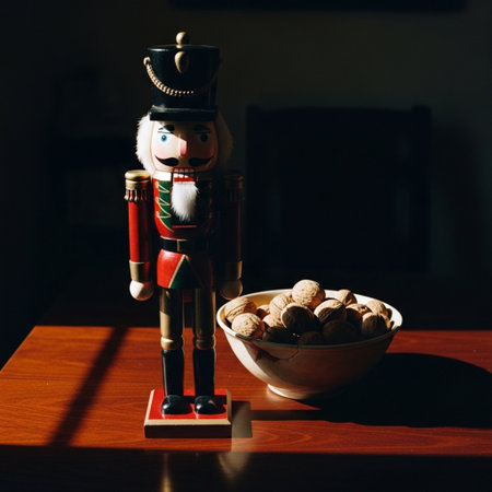 nutcracker and dried fruit composition with walnuts, almonds and peanuts to indicate its benefits