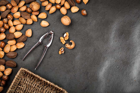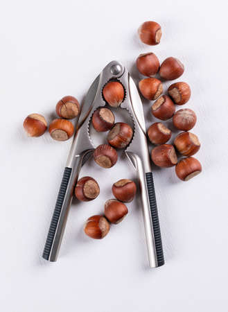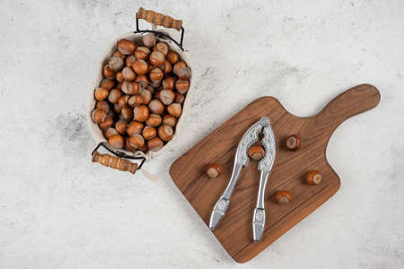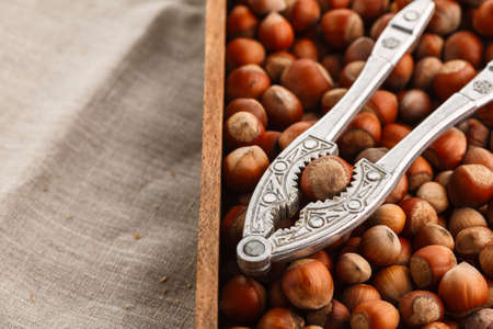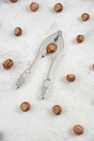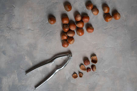 Hazelnuts with nutcracker on gray background. Top view of nuts. BIO hazelnuts.