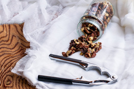 walnut kernels scattered from the jar lie on a napkin next to the nutcracker. High quality photo