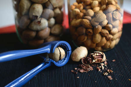 Pecan and macadamia nuts with a device for chopping nuts on a wooden background