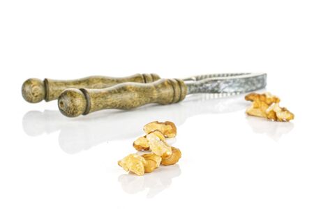 Shelled walnuts with a Nutcracker. On a rustic background.