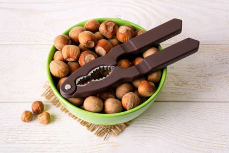 Brown nut cracker on a green bowl full of unpeeled hazelnuts over white wood table. Nuts as an antioxidant and protein source for ketogenic diet and vegetarianism. Top view.