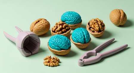 Brain-shaped models and walnuts are scattered with nutcrackers on a light green surface.