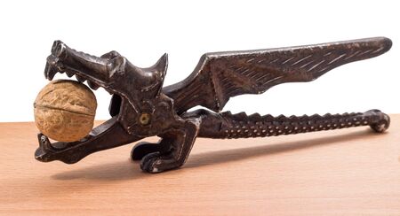 hand nut cracker for walnuts on a white background. nut cracker in the form of a dragon with an open mouth