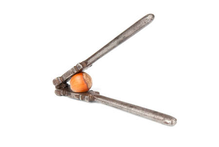 VINTAGE PLIERS SQUEEZE A HAZELNUT ISOLATED ON BLACK BACKGROUND